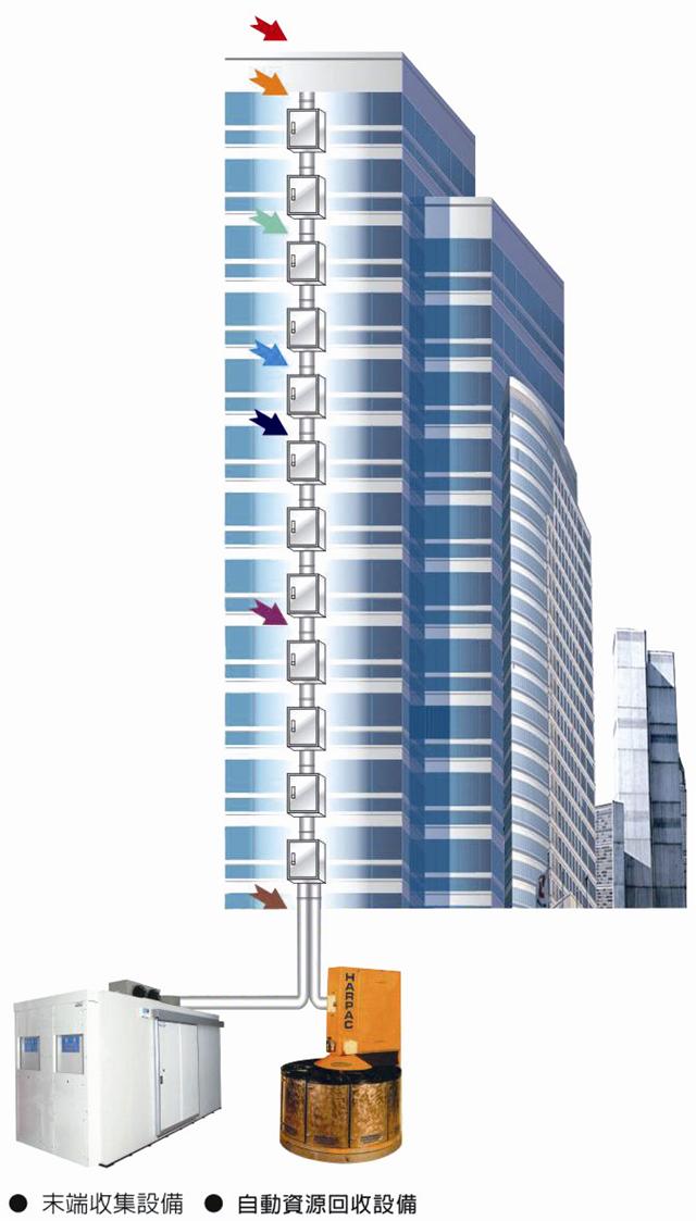 重力式收集系統(tǒng)是垃圾收集系統(tǒng)的重要方式之一,系統(tǒng)無需配置負(fù)壓風(fēng)機(jī),垃圾依靠自身重力落入豎向管道內(nèi),從垃圾投入、輸送、除臭、消毒、壓縮、貯存、排出等,全程自動(dòng)化控制,改變傳統(tǒng)的垃圾收集模式,實(shí)現(xiàn)垃圾的全封閉、不落地處理。適用于建筑規(guī)模相對(duì)較小的醫(yī)療樓、寫字樓、賓館、住宅樓等場(chǎng)所。